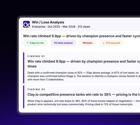 Opine generates structured win/loss analysis across deals, segments, and time periods then lets you go deeper. Build custom deep research reports using AI templates you define: win/loss by rep, objection patterns by segment, competitive win rates, forecast accuracy over time. Leadership gets the analysis that used to take a week of spreadsheet work, generated in minutes, from data that's already there.