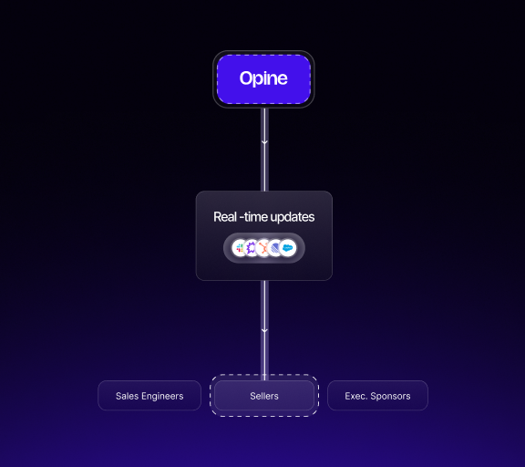 Opine extracts specific custom field values- competitors, technical requirements, next steps, stakeholder roles, deal risks and writes them to the CRM fields your reports depend on. With per-user SFDC authorization, every push respects your existing permission model. Your RevOps team gets clean data without chasing reps for updates.