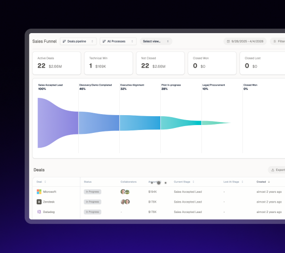 Opine gives SE leaders one workspace to manage their entire presales operation. Every deal, every POV, every team request in one place. Standardise your winning process with playbooks and POC templates, then capture the data to prove your SE org's impact: attachment rate, technical win rate, and revenue velocity by stage. No manual logging. No chasing updates.