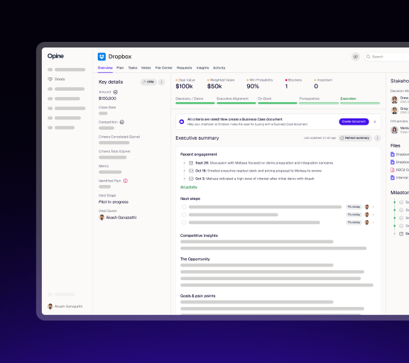 Opine builds real-time deal intelligence for every opportunity: deal history, stakeholder map, open risks, last interaction, and suggested talking points - pulled automatically from Gong, Slack, CRM, email, calendar and more. It updates continuously as new activity comes in, so your SEs never spend hunting for information. Enable your SEs to walk into calls, confidently.