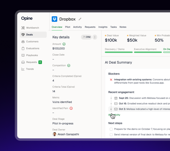 Opine automatically hands the SE everything they need before joining a deal, requirements, business objectives, champion and detractor context, risk factors, what the AE has covered, and where the solution gaps are. SEs stop asking AEs for context over Slack. AEs stop worrying the SE will show up cold. Complex sales cycles run cleaner because both sides are working from the same picture.