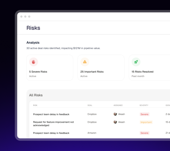 Never let deals stall over confirmations, unaddressed blocker or key stakeholders slipping away.Opine tracks real momentum signals across every deal activity and surfaces patterns where deals are slowing down early enough to act. Faster decisions, shorter cycles, no revenue abandoned in pipeline.