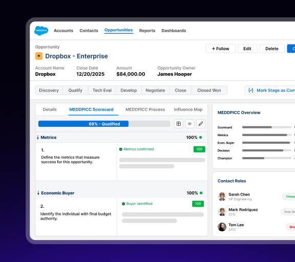 MEDDPICC, 3 Why’s, SPICED or your preferred qualification fields are filled from real conversations. Contact roles updated based on latest activity. Right use cases documented, cross-functional fields for SE, CS, and RevOps filled to the same standard. Opine reads every interaction and pushes structured updates back to CRM so your pipeline reflects one version of the truth, regardless of who worked on the deal.